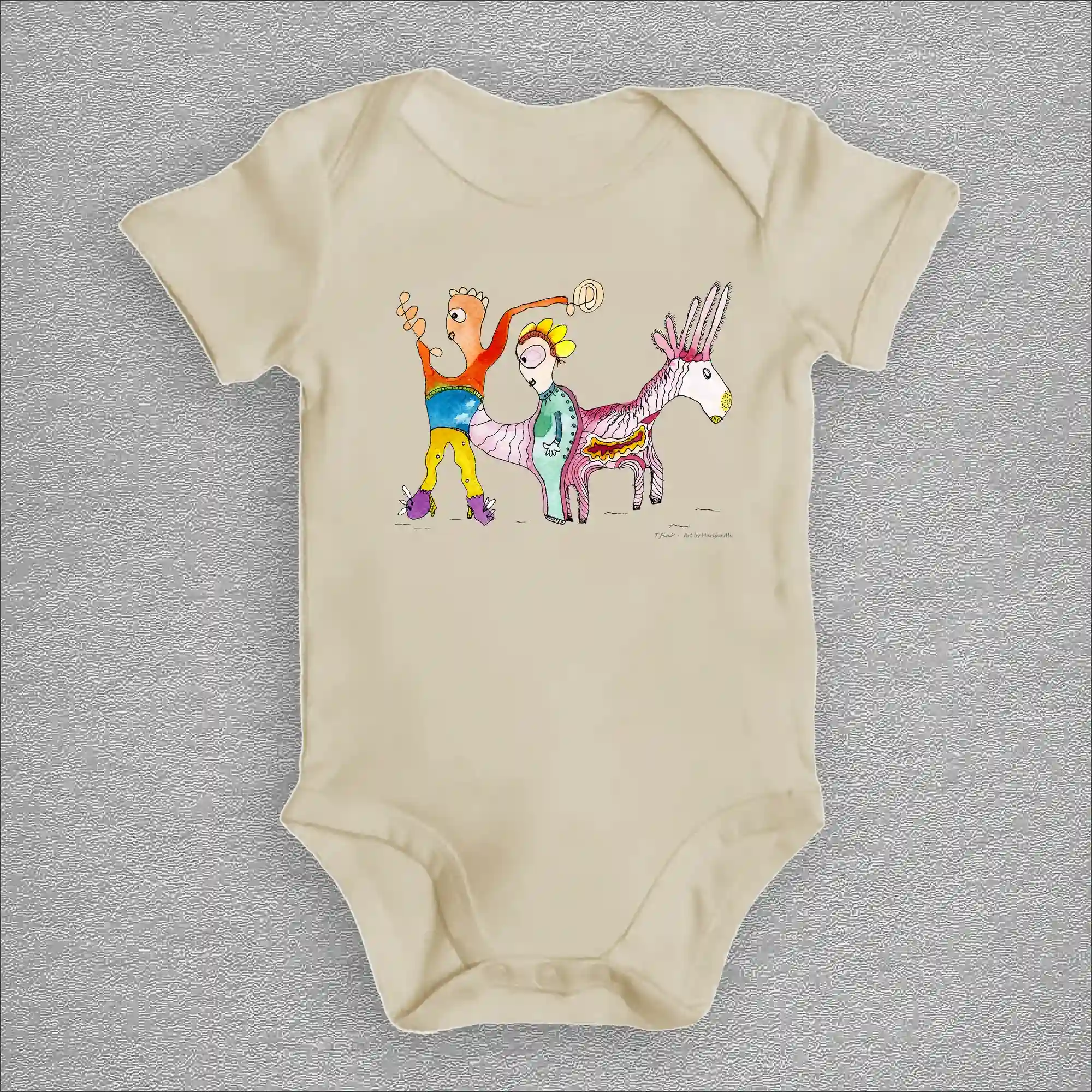 Organic cotton baby bodysuit, colour organic natural, front design aquarelle painting by Marijke Ali, t-finsBaby bodysuit
