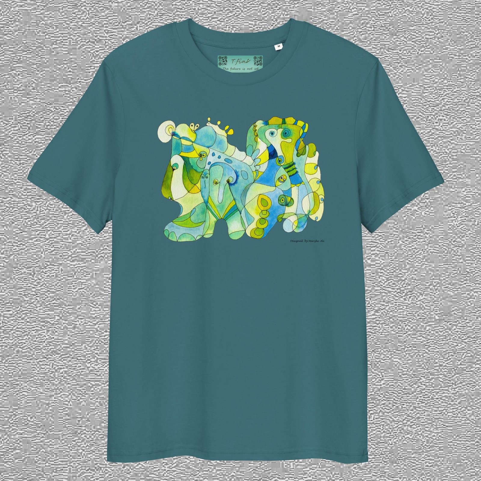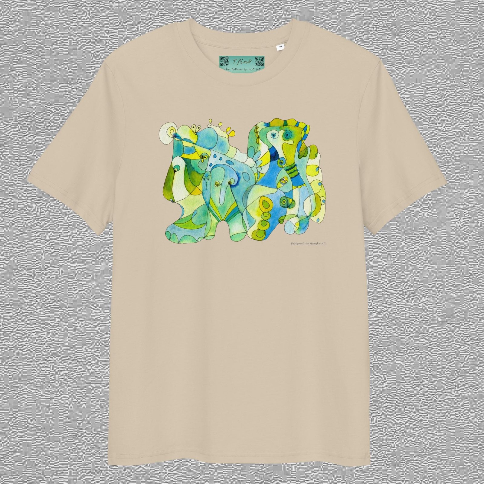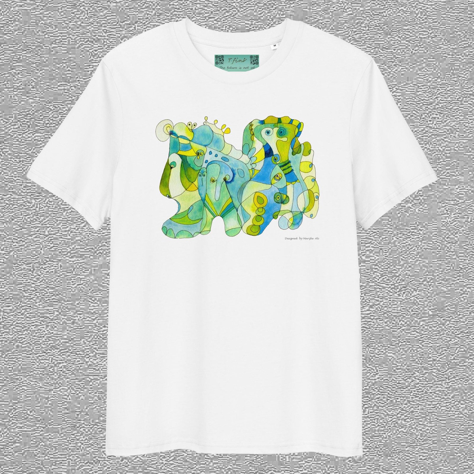 unisex, organic cotton t-shirt, white colour, front design aquarelle painting by Marijke Ali, t-finsEco t-shirt