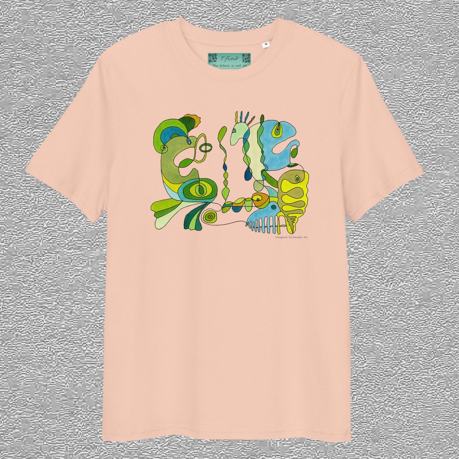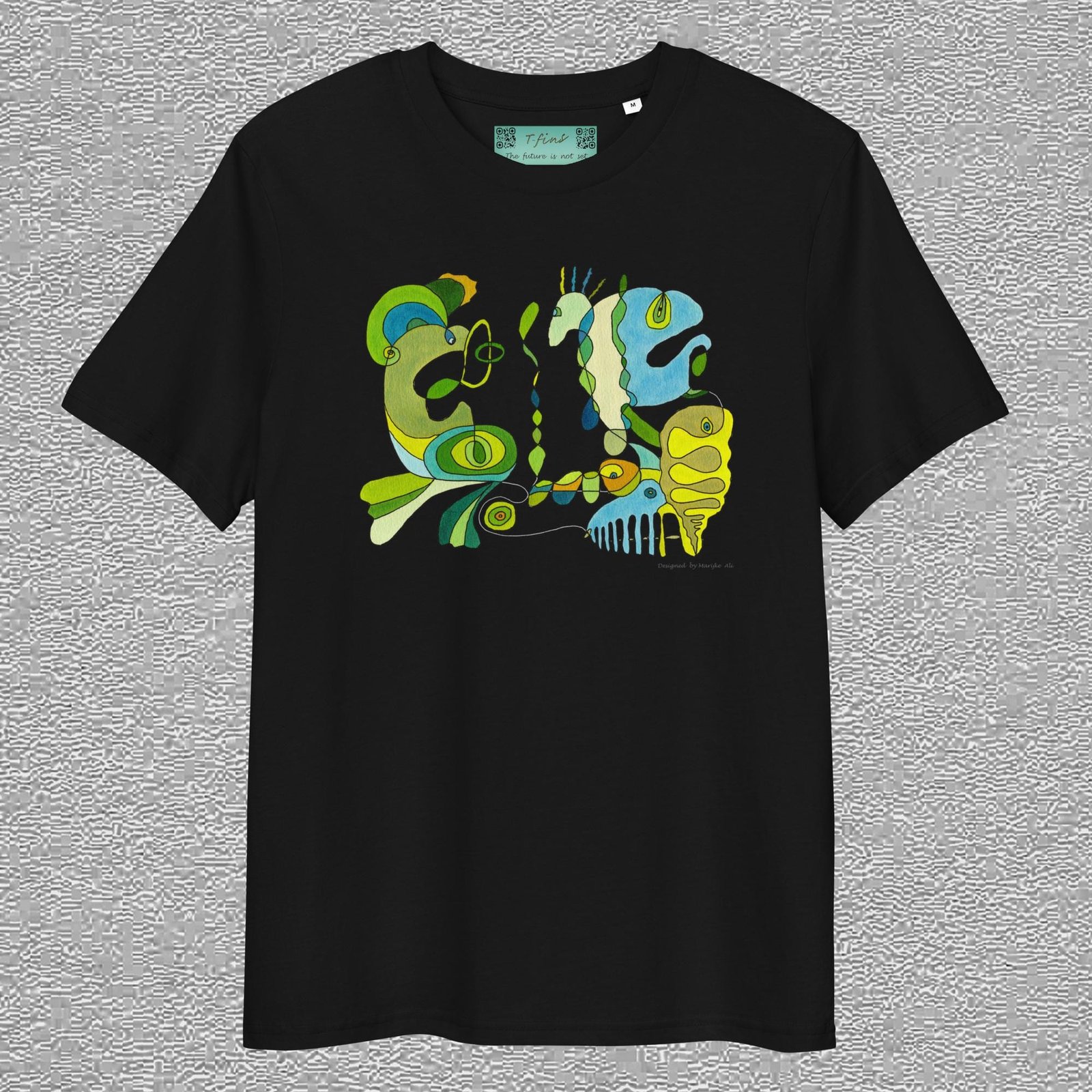 unisex, organic cotton t-shirt, dark heather blue colour, front design aquarelle painting by Marijke Ali, t-finsEco t-shirt