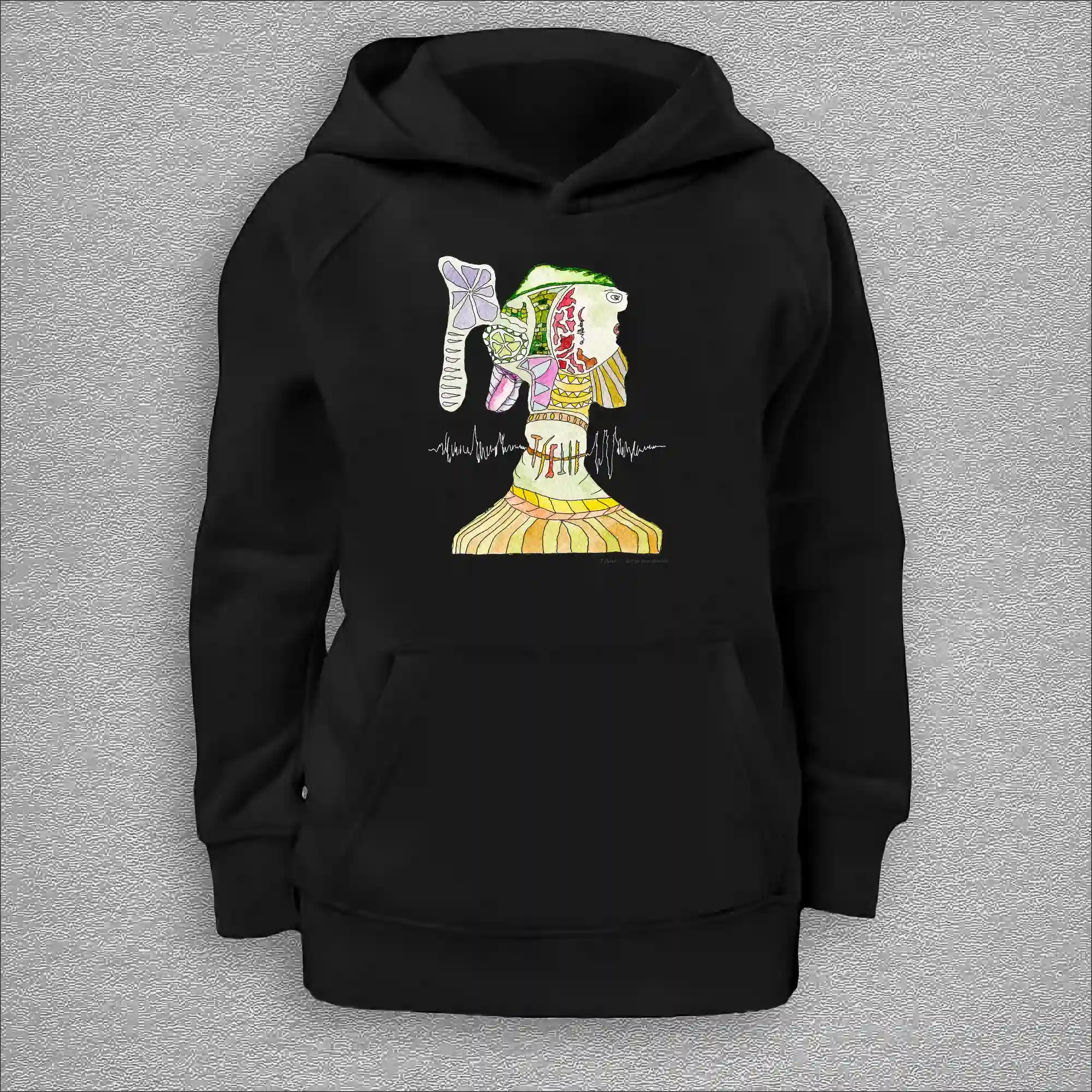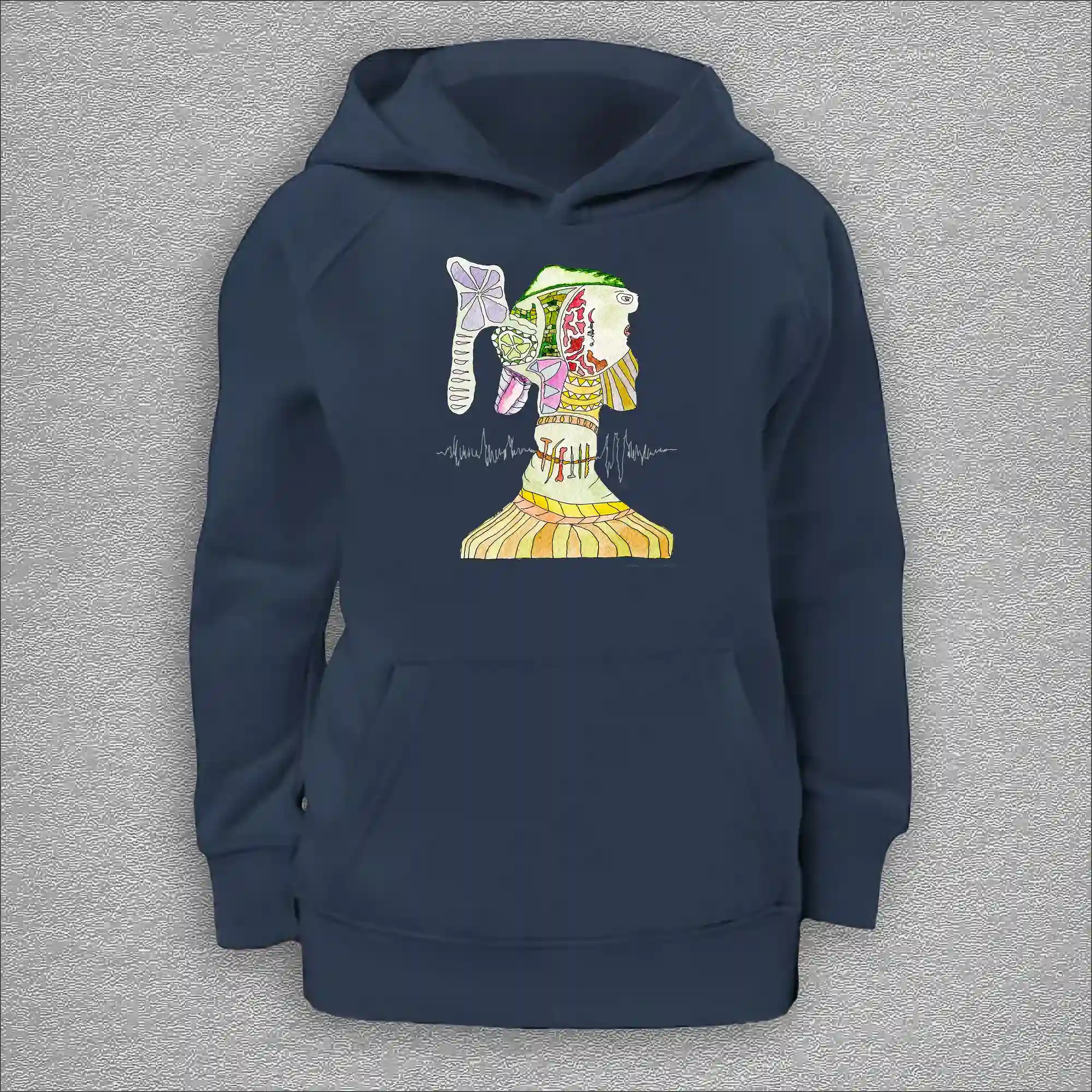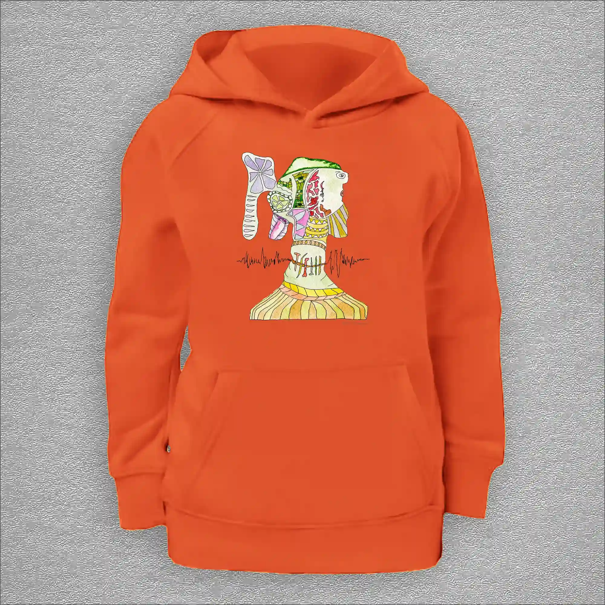 kids organic hoodie, outside 100% organic cotton, inside 80% organic cotton and 20% recycled polyester, font pouch pocket, raglan sleeves, colour burnt orange, 12 years old, front design aquarelle painting by Marijke Ali, t-finsKids Hoodie