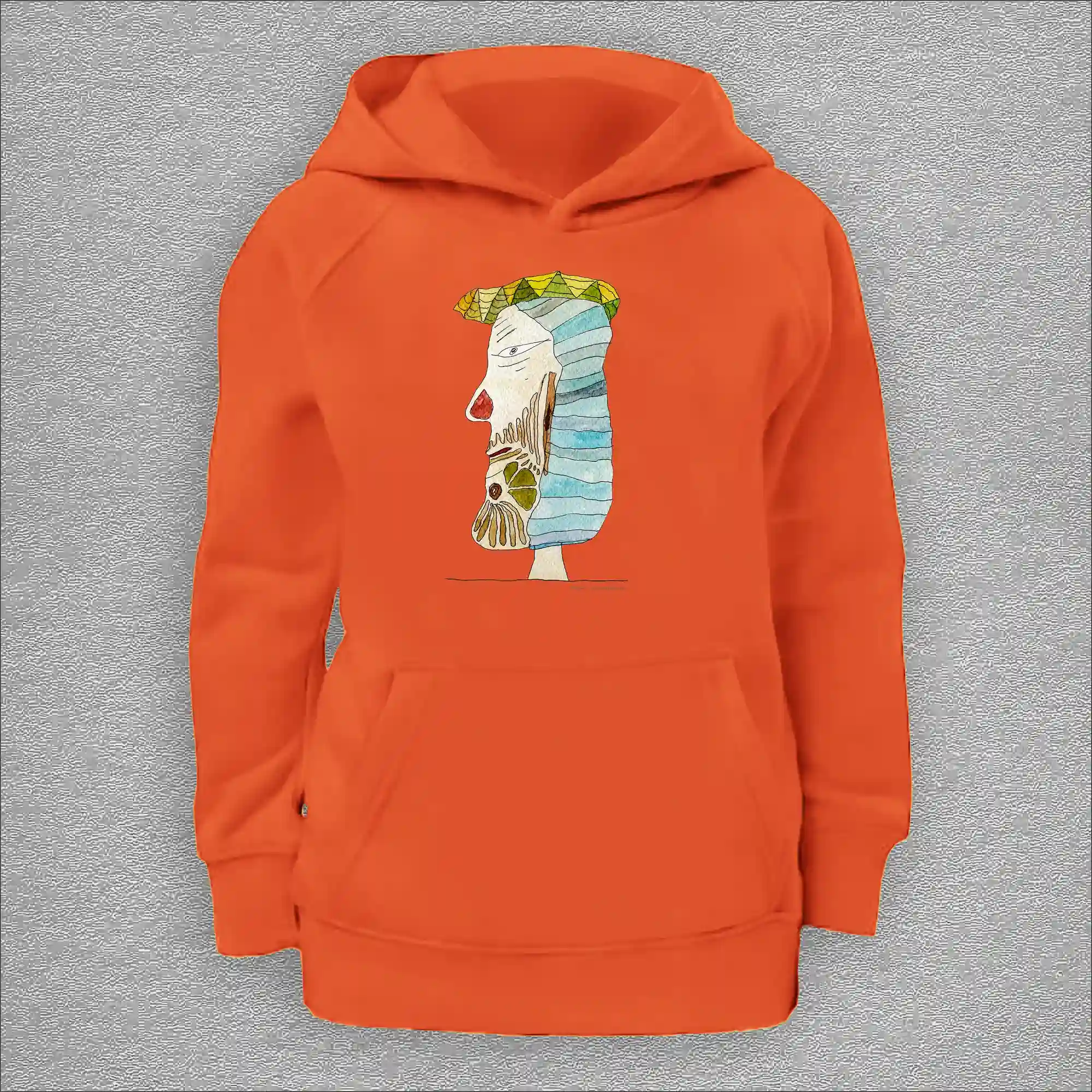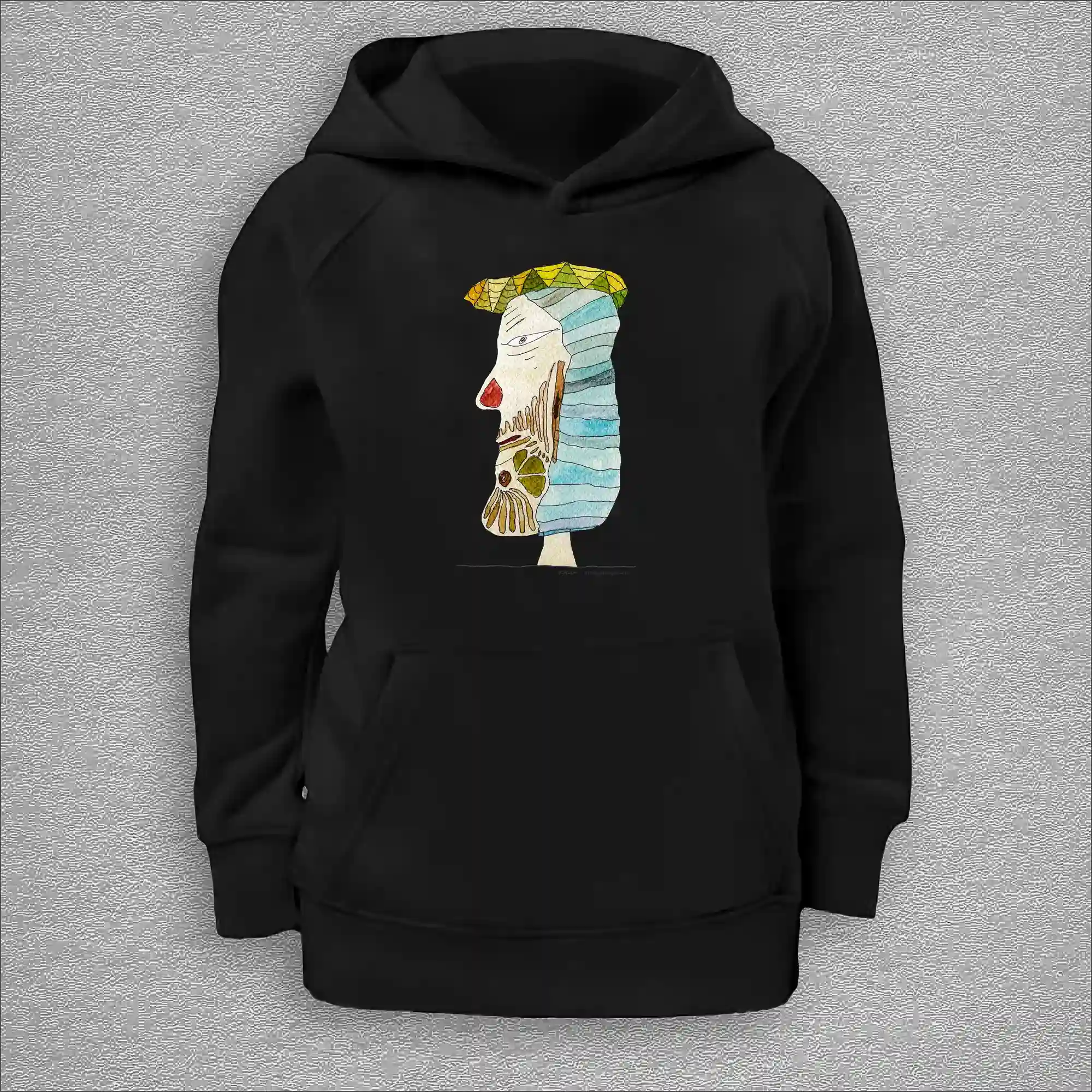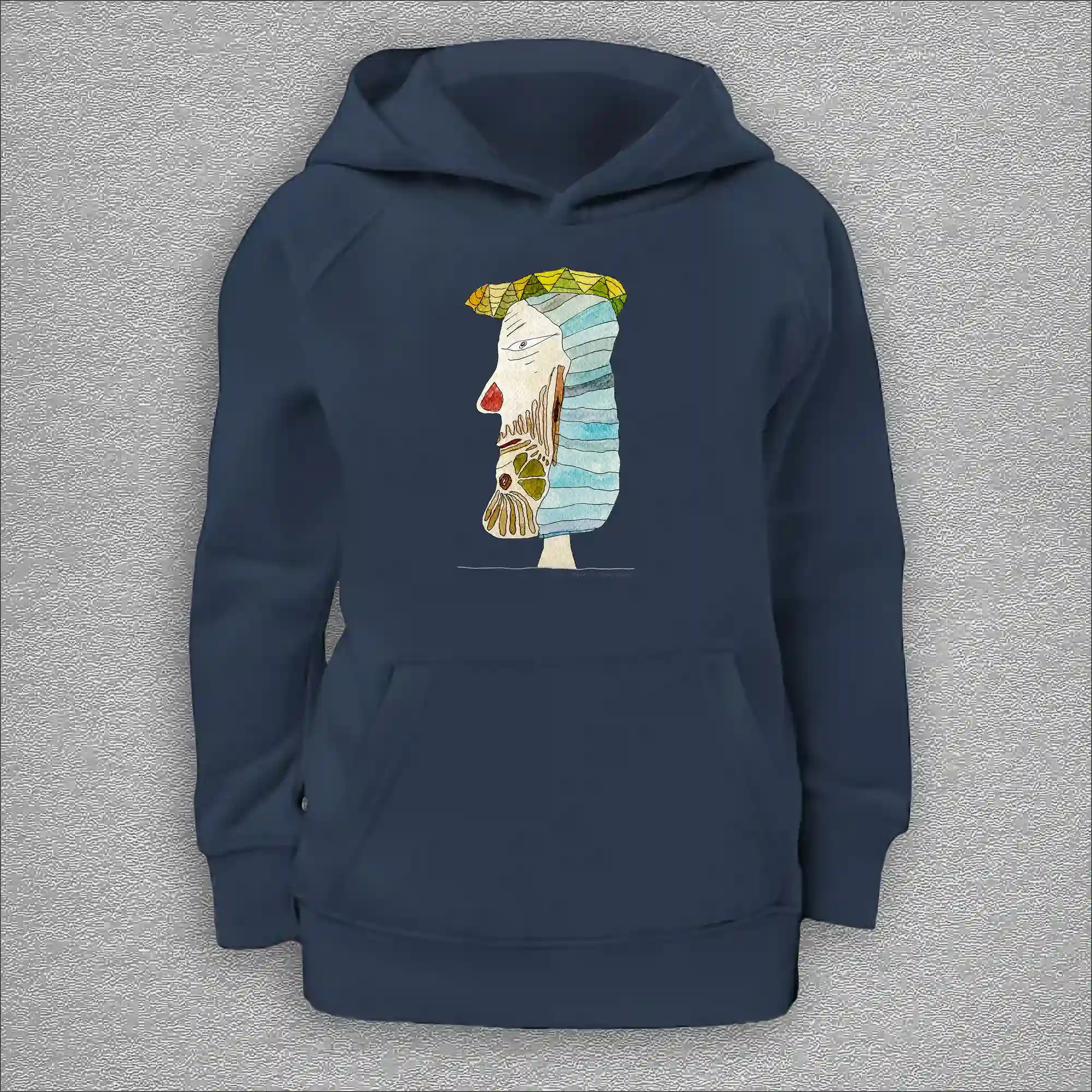 kids organic hoodie, outside 100% organic cotton, inside 80% organic cotton and 20% recycled polyester, font pouch pocket, raglan sleeves, colour french navy, 12 years old, front design aquarelle painting by Marijke Ali, t-finsKids Hoodie