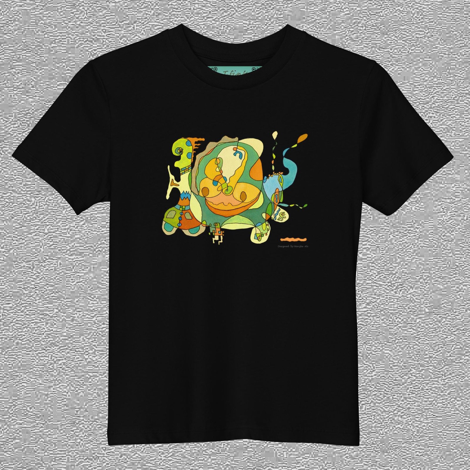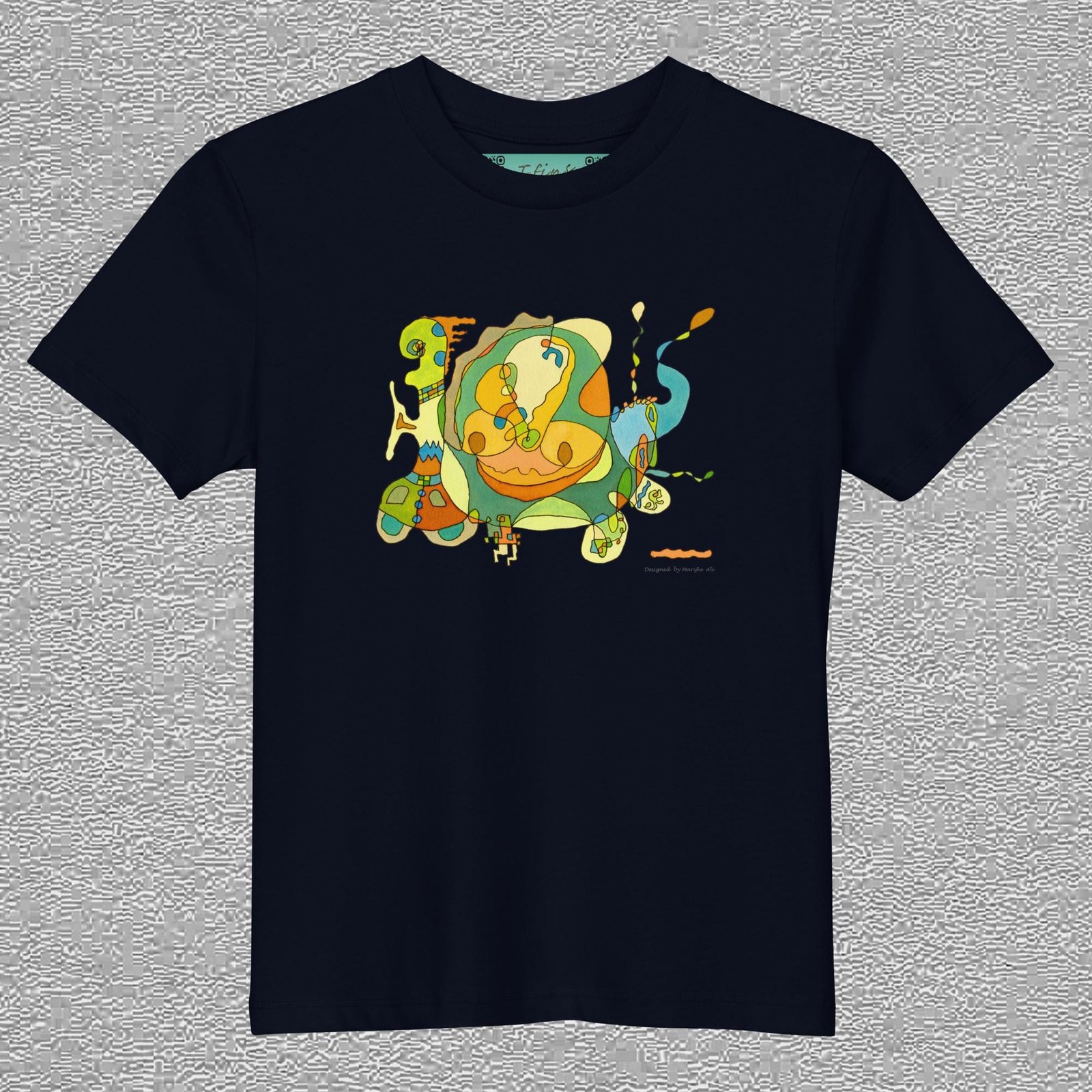organic cotton kids t-shirt, colour black, front design aquarelle painting by Marijke Ali, t-finsKids t-shirt