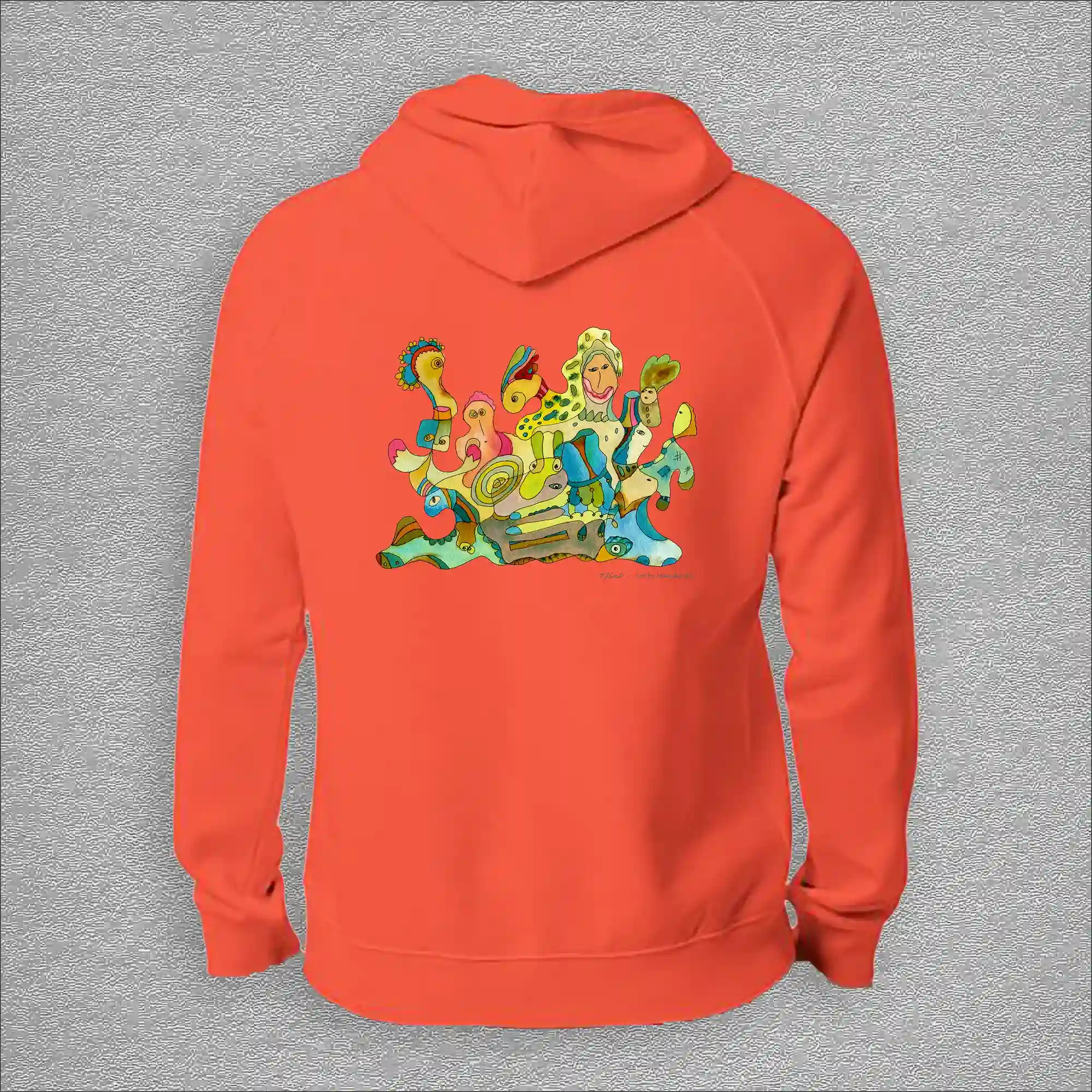 Unisex, eco raglan hoodie, colour burnt orange, back design aquarelle painting by Marijke Ali, t-finsRaglan hoodie