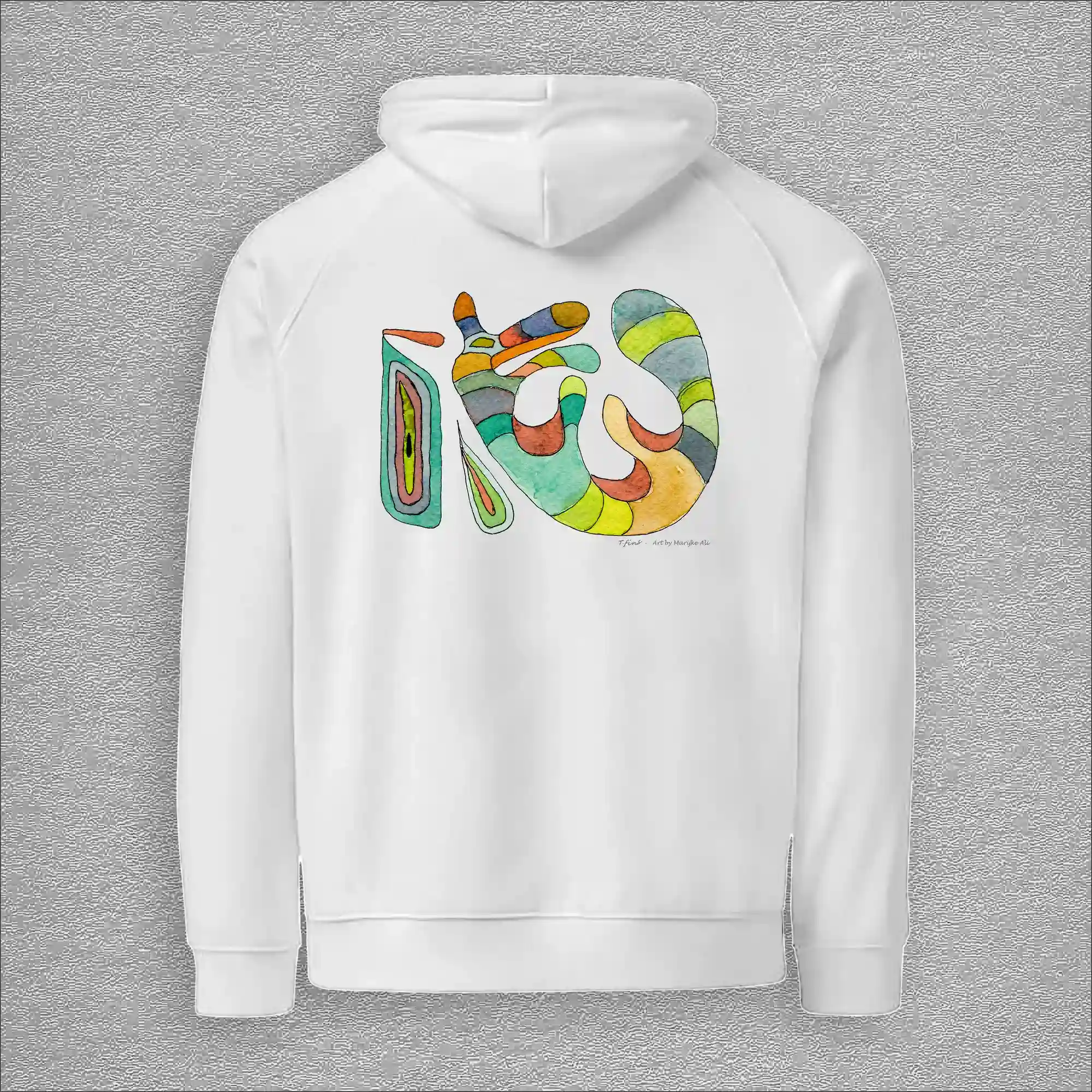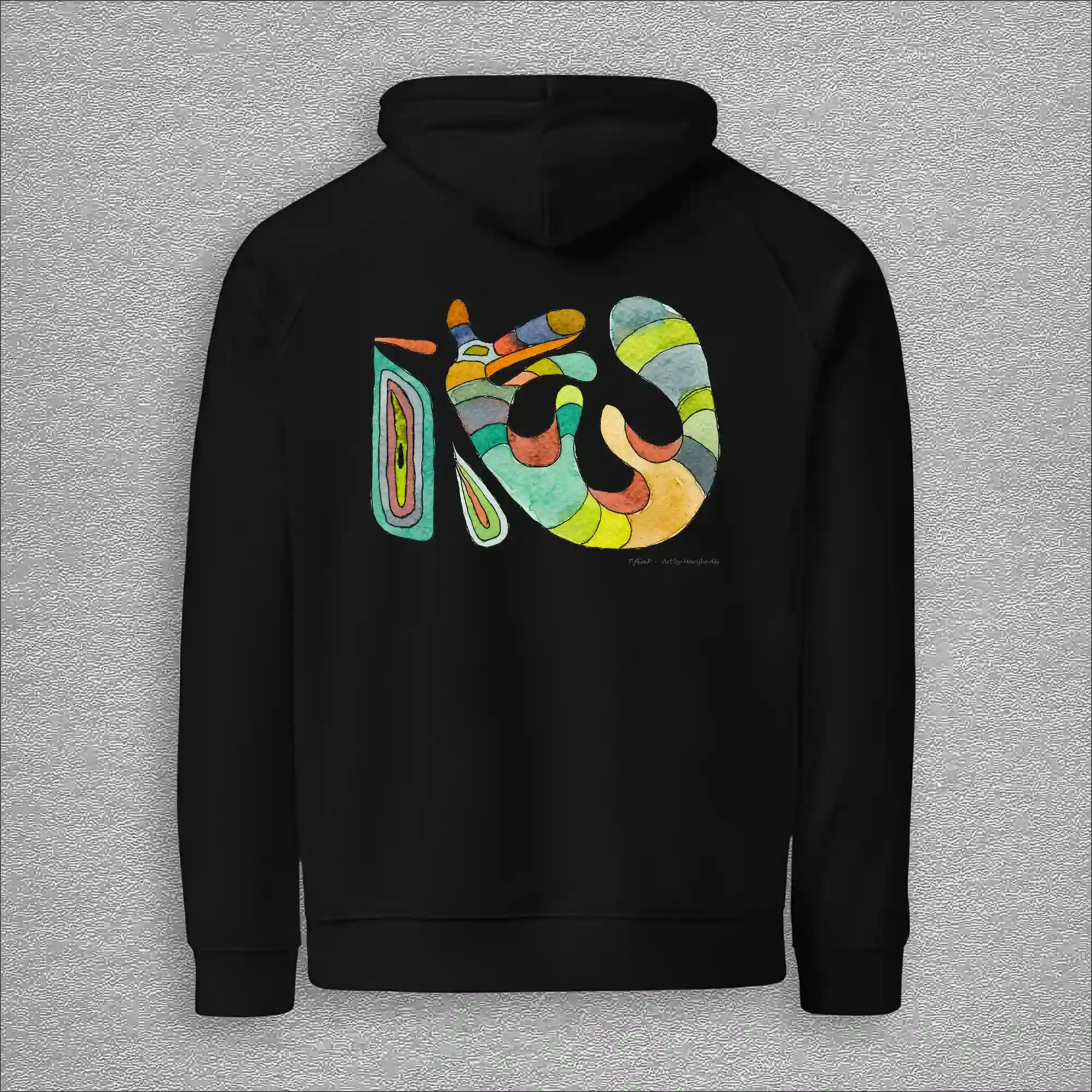 Unisex, eco raglan hoodie, colour black, back design aquarelle painting by Marijke Ali, t-finsRaglan hoodie