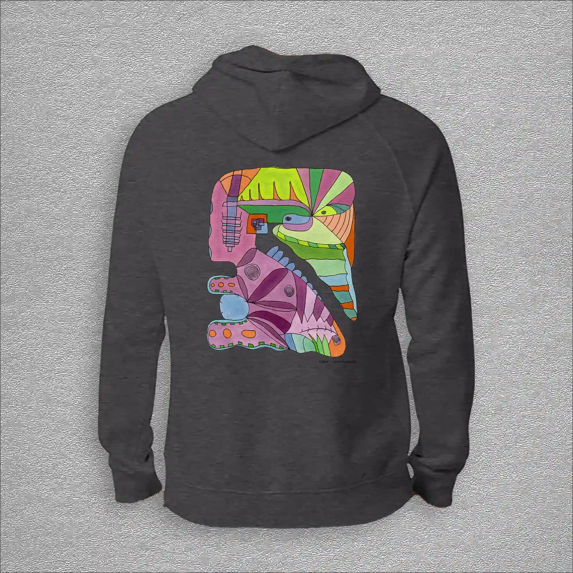 Unisex, eco raglan hoodie, colour charcoal melange, back design aquarelle painting by Marijke Ali, t-finsRaglan hoodie