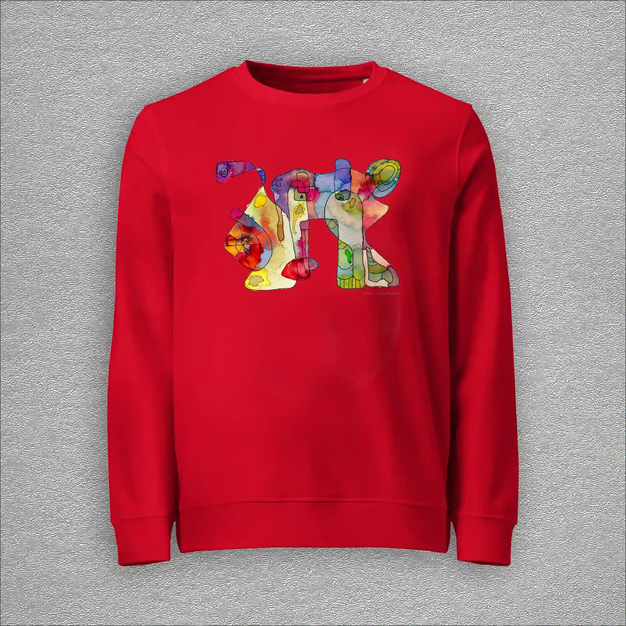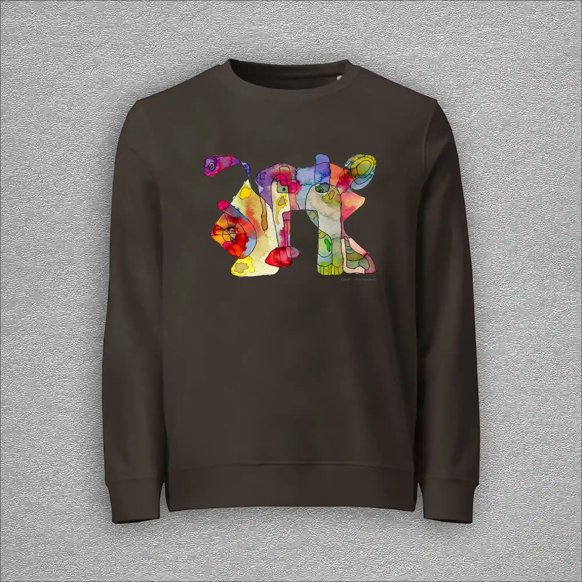 Unisex, organic cotton and recycled polyester sweatshirt, set-in sleeves, french terry knit, colour bottle green, front design aquarelle painting by Marijke Ali, t-finsSweatshirt