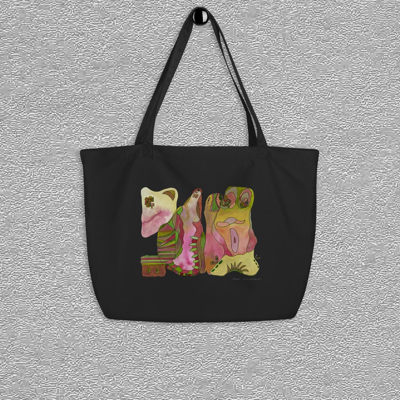 Oyster Organic certified cotton totebag, abstract pink/green characters aquarelle painting by Marijke Ali, T-finsTote bag – large